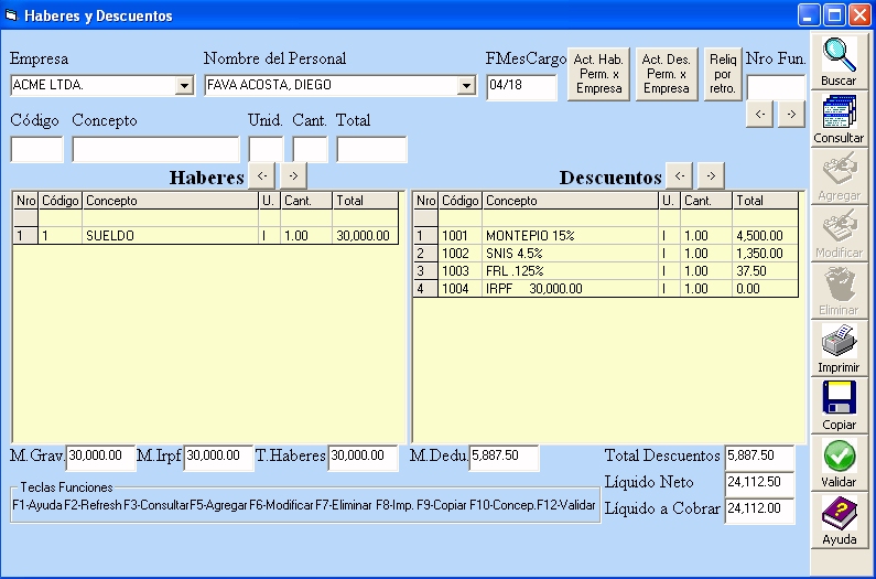 Conceptos y fórmulas precargadas: el sistema posee capacidad ilimitada de conceptos y fórmulas (además de variables) y se encuentran precargadas las más comunes, pudiendo ser modificables por el usuario.