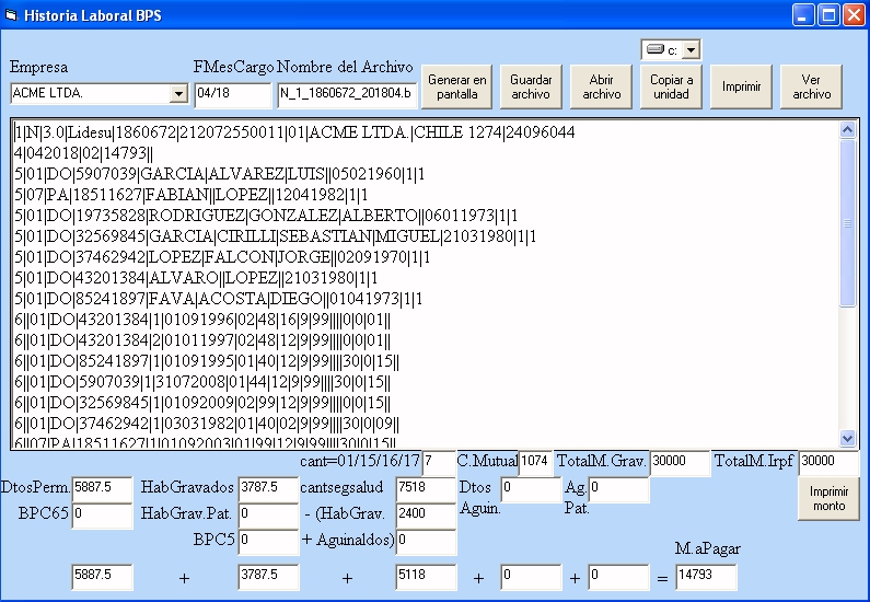 Nóminas, Rectificativas y Deducciones: el sistema está permanentemente actualizado con la última versión en formato ATYR y genera la Historia Laboral (calculando el monto a pagar de la empresa), las Rectificativas y el archivo de Deducciones (formulario 3100) para el BPS (tanto en Industria y Comercio como para empresas Rurales y de Construcción).