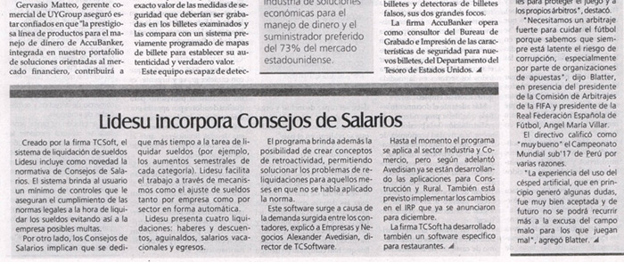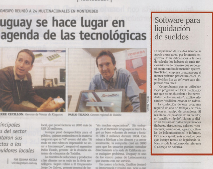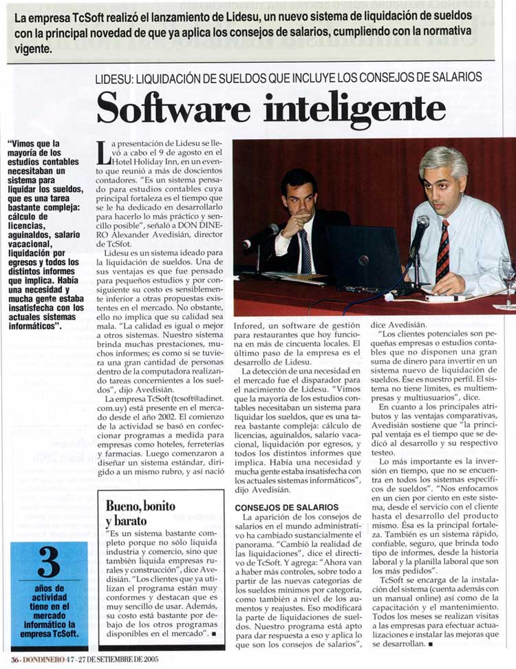 | 09-08-05 TCSOFT LANZO SU NUEVO SISTEMA DE SUELDOS "LIDESU" QUE INCLUYE CONSEJOS DE SALARIOS EN EL HOTEL HOLIDAY INN DONDE CONCURRIERON MAS DE 150 CONTADORES PUBLICOS | |||